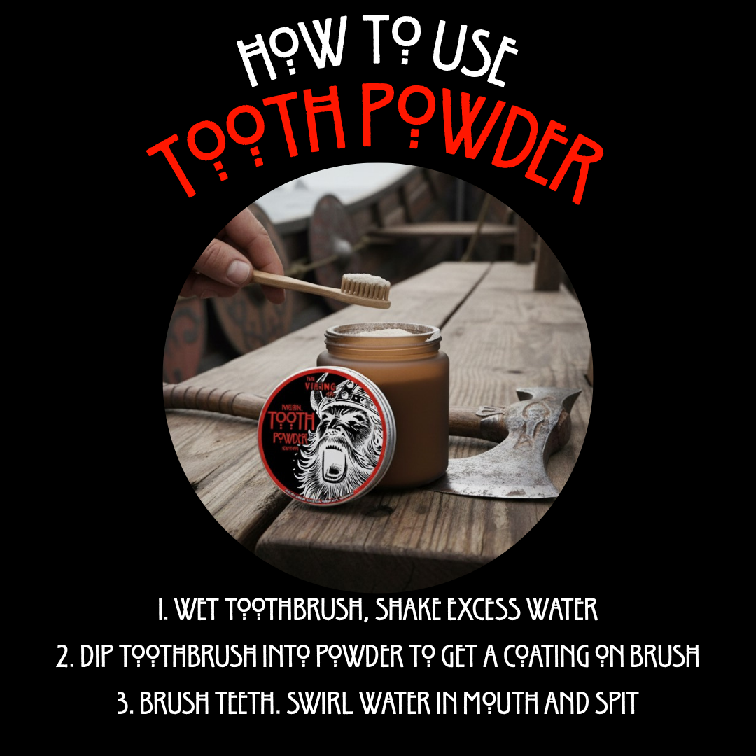 Clean your teeth the Viking way—no fluoride, no chemicals, just pure, natural ingredients. Our tooth powder combines egg shell powder, coconut oil, and baking soda to freshen your breath, whiten your teeth, and keep your mouth healthy. A powerful, simple formula for a cleaner, fresher smile.