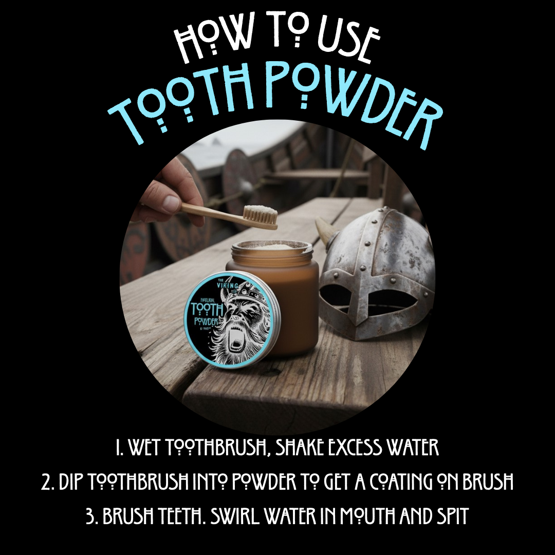 Clean your teeth the Viking way—no fluoride, no chemicals, just pure, natural ingredients. Our tooth powder combines egg shell powder, coconut oil, and baking soda to freshen your breath, whiten your teeth, and keep your mouth healthy. A powerful, simple formula for a cleaner, fresher smile.